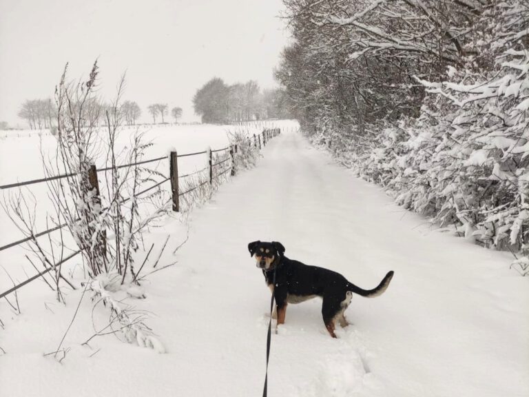 Das Foto zeigt meine leider verstorbene Hündin Maddie im Winter 2023. Sie erinnert mich daran, das Schöne im Moment zu sehen. Dieses Mal wünsche ich mir aber bitte noch blauen Himmel und Sonne dazu.